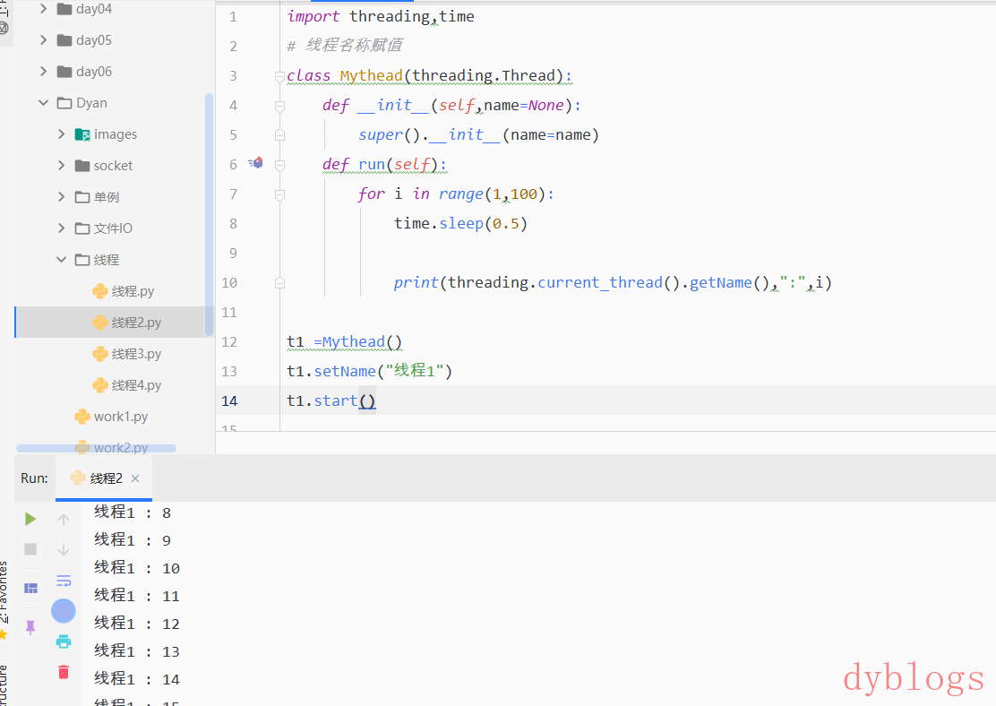 import threading,time # 线程名称赋值 class Mythead(threading.Thread): def __init__(self,name=None): super().__init__(name=name) def run(self): for i in range(1,100): time.sleep(0.5) print(threading.current_thread().getName(),":",i) t1 =Mythead() t1.setName("线程1") t1.start() |