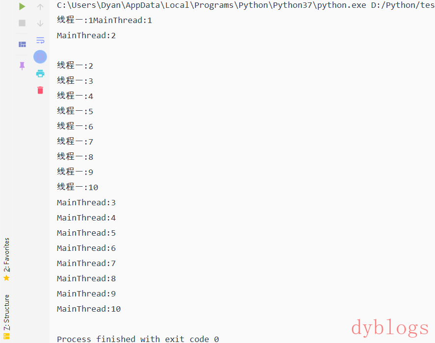 import threading def run(): for i in range(1,11): print(threading.current_thread().getName()+":"+str(i)) t1=threading.Thread(target=run,name="线程一") t1.start() t2=threading.Thread(target=run,name="线程二") t2.start() |