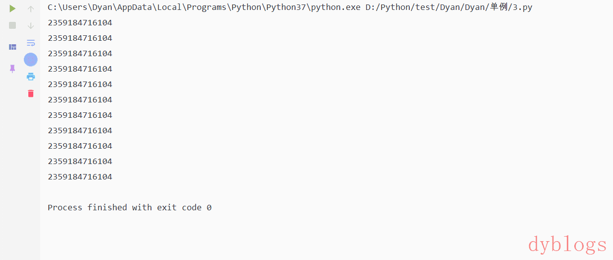 import threading lock=threading.Lock() class Singleton: #定义静态变量 __instance=None def __new__(cls): lock.acquire() if cls.__instance is None: cls.__instance=object.__new__(cls) lock.release() return cls.__instance #测试方法一 print(id(Singleton())) print(id(Singleton())) #测试方法二 def test_singleton(): print(id(Singleton())) for i in range(1,10): threading.Thread(target=test_singleton()).start() |