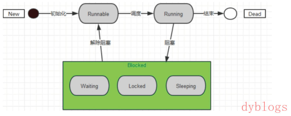 Ø 新建: 当一个Thread类或其子类的对象被声明并创建时,新生的线程对象处于新建状态